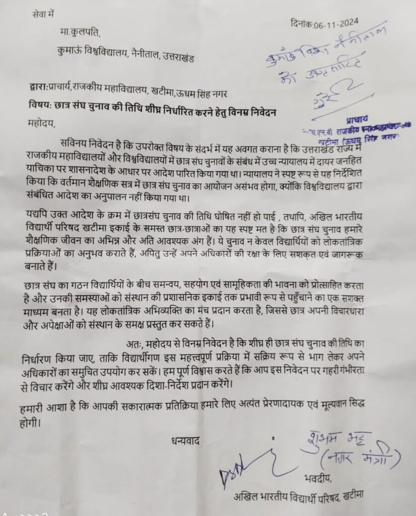 खटीमा। अखिल भारतीय विद्यार्थी परिषद (एबीवीपी) खटीमा इकाई ने राजकीय महाविद्यालय खटीमा के प्रभारी प्राचार्य, असिस्टेंट प्रोफेसर डॉ. गुरवेंद्र सिंह के माध्यम से कुमाऊं विश्वविद्यालय, नैनीताल के कुलपति को ज्ञापन भेजा। ज्ञापन में छात्र-छात्राओं ने वर्तमान शैक्षिक सत्र के लिए छात्र संघ चुनाव की तिथि शीघ्र घोषित करने का आग्रह किया है।