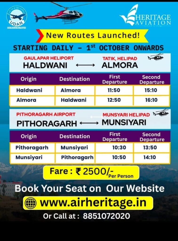 प्रतिदिन चलने वाली इस हवाई सेवा को हेरिटेज एविएशन के माध्यम से संचालित किया जाएगा। यह सेवा दिन में दो बार अल्मोड़ा से हल्द्वानी के बीच चलेगी। पहली उड़ान 12:50 पर रवाना होगी तथा दूसरी उड़ान का समय 16:10 बजे रहेगा। किराया 2,500/- रुपए रहेगा। यात्री https://airheritage.in/ के माध्यम से ऑनलाइन टिकट बुक कर सकते हैं।