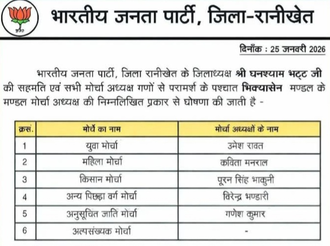 भिकियासैंण (अल्मोड़ा)। भारतीय जनता पार्टी जिला रानीखेत के अंतर्गत भिकियासैंण मंडल में विभिन्न मोर्चों के अध्यक्षों की घोषणा कर दी गई है। यह घोषणा जिला अध्यक्ष घनश्याम भट्ट की सहमति एवं सभी मोर्चा अध्यक्षों से परामर्श के उपरांत की गई।