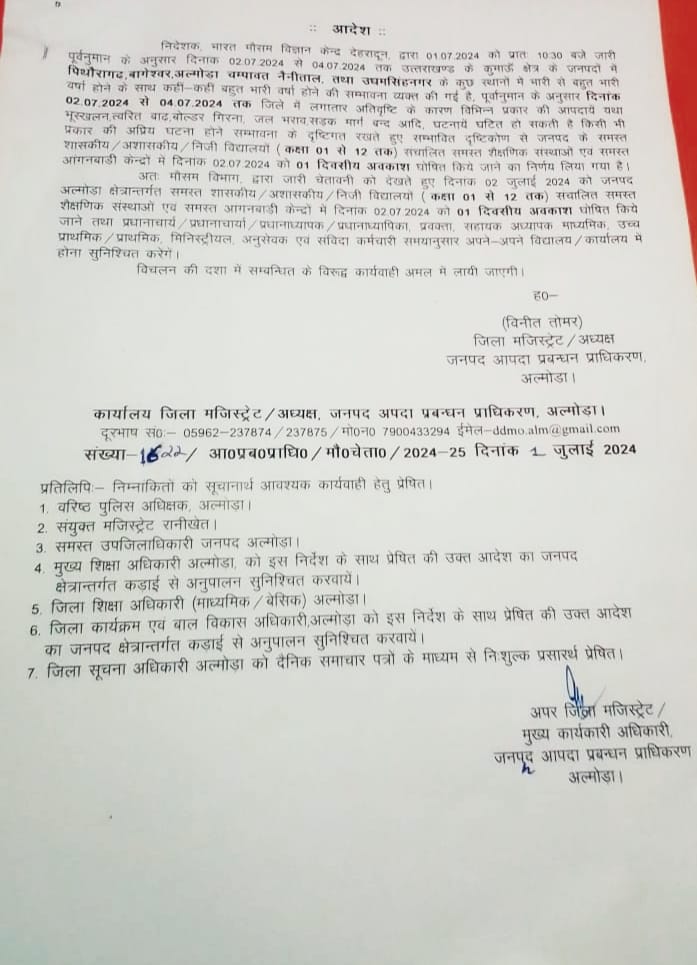 рдЬрд┐рд▓рд╛ рдЕрд▓реНрдореЛрдбрд╝рд╛ рдореЗрдВ 2 рдЬреБрд▓рд╛рдИ рдХреЛ рд╕реНрдХреВрд▓ рд░рд╣реЗрдВрдЧреЗ рдмрдВрдж, рджреЗрдЦреЗрдВ рдЖрджреЗрд╢ред