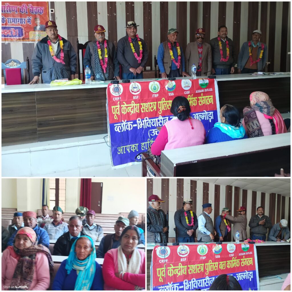 भिकियासैंण (अल्मोड़ा)। केन्द्रीय सशस्त्र पुलिस बल कार्मिक संगठन ब्लॉक भिकियासैंण की एक बैठक ब्लॉक सभागार भिकियासैंण में आयोजित की गई। बैठक की अध्यक्षता पूर्व डिप्टी कमांडेंट एवं जिलाध्यक्ष अल्मोड़ा तारादत्त शर्मा ने की। बैठक में चुनाव प्रभारी खीम सिंह रावत एवं गोपाल सिंह की देख-रेख में नई कार्यकारिणी का गठन किया गया।