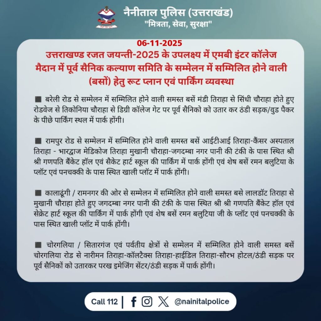 यातायात व्यवस्था: कैंची धाम यात्रा रुट पर ट्रैफिक डायवर्जन लागू। नैनीताल। दिनाँक 23 नवंबर 2025 (रविवार) को कैंची धाम यात्रा रुट पर वाहनों का दबाव अधिक होने पर पुलिस प्रशासन द्वारा प्रातः 08:00 बजे से पर्यटक एवं भारी वाहनों हेतु अस्थायी यातायात एवं डायवर्जन प्लान लागू किया गया है। पुलिस द्वारा जारी व्यवस्था के अनुसार …