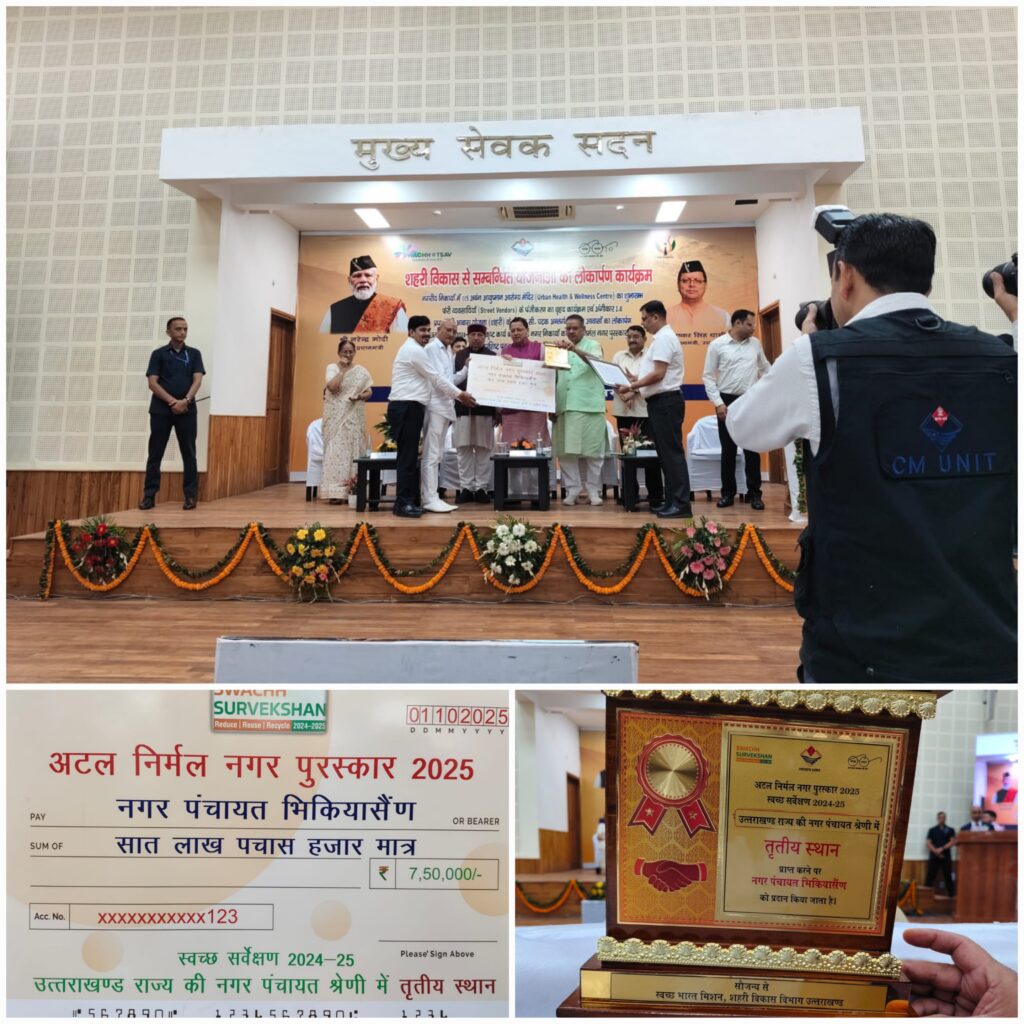नगर पंचायत भिकियासैंण ने लगातार दूसरी बार प्राप्त किया अटल निर्मल नगर पुरस्कार, सीएम ने दिया चेक।