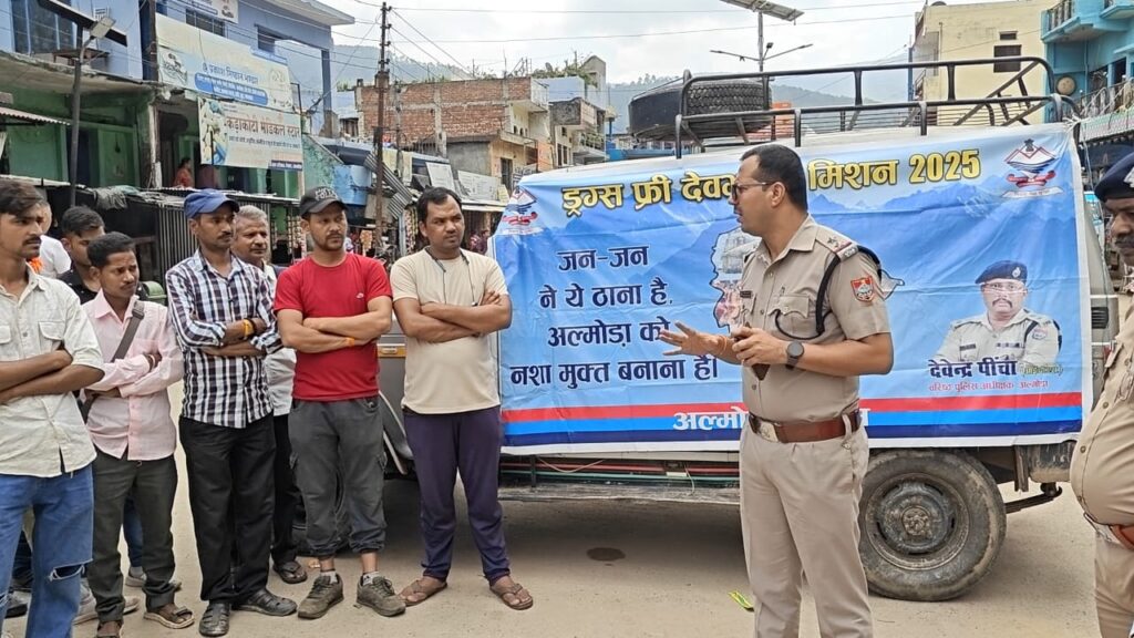भिकियासैंण। एसएसपी अल्मोड़ा के निर्देशन में नशा मुक्त पखवाड़ा के तहत थाना देघाट टीम ने जनमानस को नशे के विरुद्ध जागरुक किया। वरिष्ठ पुलिस अधीक्षक देवेन्द्र पींचा अल्मोड़ा द्वारा अन्तराष्ट्रीय ड्रग्स दिवस के क्रम में प्रचलित “नशा मुक्त भारत पखवाड़ा” 12 जून से 26 जून 2025 तक के तहत जनपद के समस्त सीओ व थाना, यातायात प्रभारियों को निर्धारित कार्यक्रम के अनुसार जनजागरुकता अभियान चलाकर जनमानस को ड्रग्स के प्रति जागरुक करने हेतु निर्देशित किया गया है।