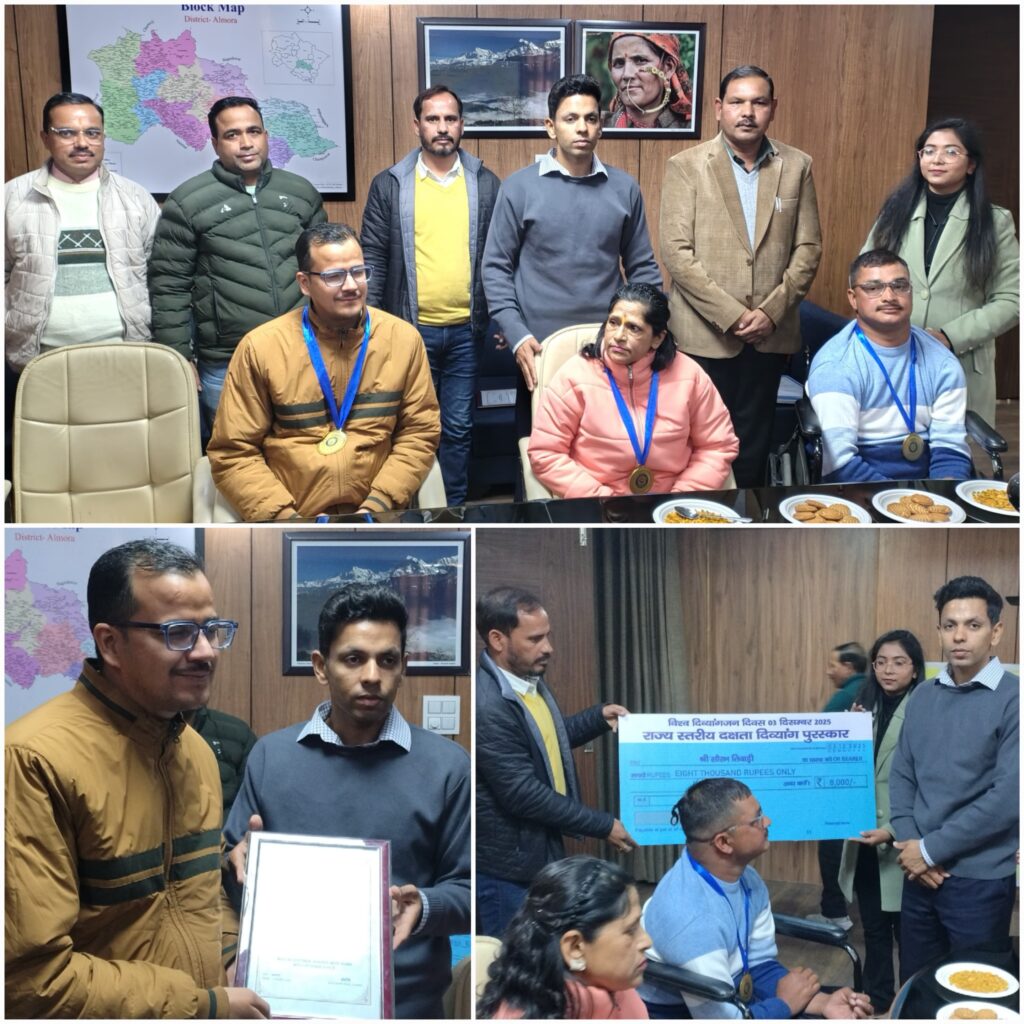 अल्मोड़ा। विश्व दिव्यांग दिवस के अवसर पर जिलाधिकारी अंशुल सिंह ने उत्कृष्ट कार्य करने वाले तीन दक्ष दिव्यांगजनों को राज्य स्तरीय दिव्यांग पुरस्कार देकर सम्मानित किया।