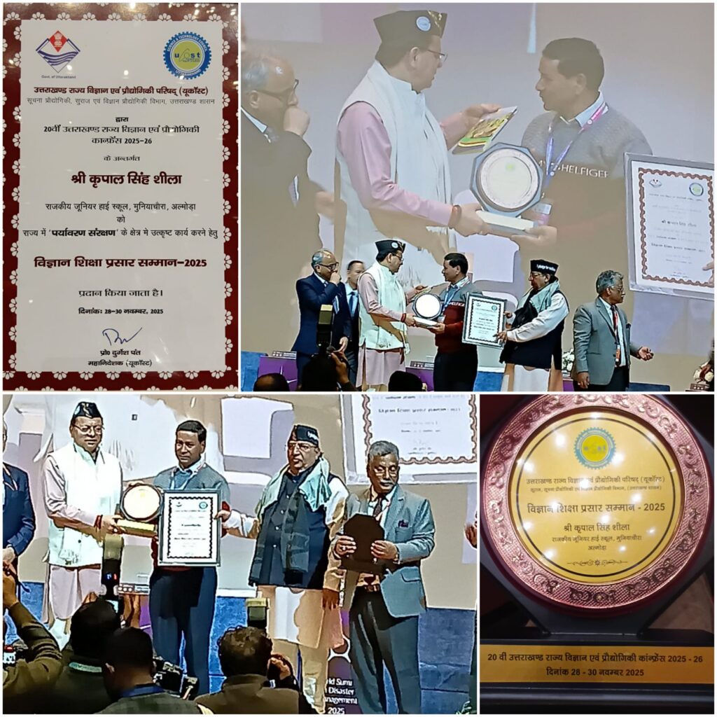 भिकियासैंण (अल्मोड़ा)। उत्तराखंड राज्य विज्ञान एवं प्रौद्योगिकी परिषद तथा सूचना प्रौद्योगिकी, सुराज एवं विज्ञान प्रौद्योगिकी विभाग उत्तराखंड शासन देहरादून द्वारा 28 से 30 नवंबर 2025 तक ग्राफिक एरा विश्वविद्यालय, देहरादून में आयोजित 20वीं उत्तराखंड राज्य विज्ञान एवं प्रौद्योगिकी कांफ्रेंस में विज्ञान शिक्षक कृपाल सिंह शीला, सहायक अध्यापक विज्ञान, भिकियासैंण को विज्ञान शिक्षा प्रसार सम्मान–2025 से सम्मानित किया गया।