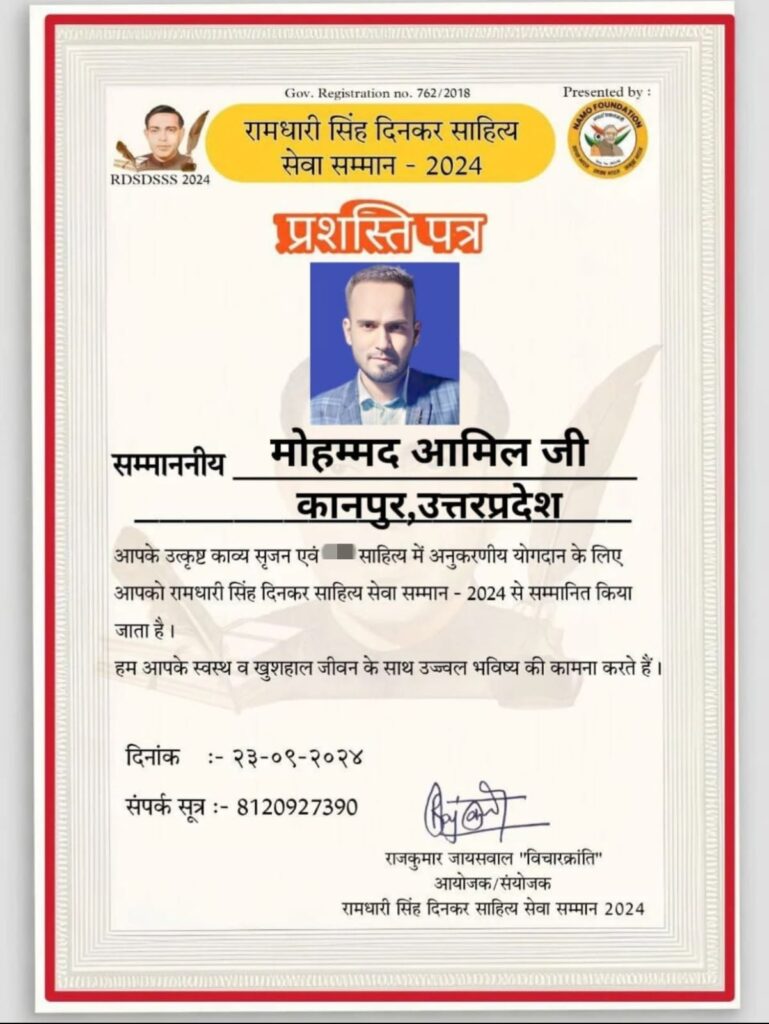 कानपुर के मो. आमिल को “रामधारी सिंह दिनकर साहित्य सेवा सम्मान 2024” से किया गया सम्मानित।