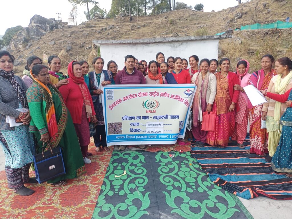 भिकियासैंण। विकासखंड स्याल्दे के ग्राम पंचायत लालनगरी में दीनदयाल अन्त्योदय योजना के अन्तर्गत राष्ट्रीय ग्रामीण आजीविका मिशन पर मधुमक्खी प्रशिक्षण दिया गया। ब्लॉक मिशन प्रबन्धन इकाई स्याल्दे द्वारा ग्राम पंचायत भरसोली के आशा, निरंकार देवता, हर हर महादेव, देवी माँ, जय माँ, जय नन्दा, सिद्धेश्वर महादेव उत्पादक समूहों के 30 महिलाओं को स्वरोजगार प्राप्त हेतु भगत सिंह खत्री द्वारा एक दिवसीय मधुमक्खी पालन प्रशिक्षण दिया गया। इस अवसर पर प्रशासक मीनाक्षी देवी, महेन्द्र सिंह बंगारी, ब्लॉक मिशन प्रबंधन समिति के सहायक लेखाकारी महेन्द्र सिंह मंच्वाड़ी मौजूद थे।