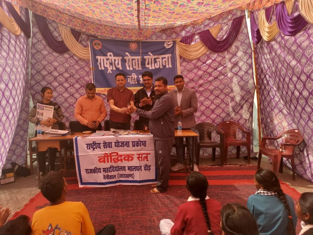 मालधनचौड़। राजकीय महाविद्यालय मालधनचौड़ नैनीताल की राष्ट्रीय सेवा योजना के विशेष शिविर के छठवे दिवस में कार्यक्रम अधिकारी प्रो. मनोज कुमार के निर्देशन में प्रातः काल में योगा पायल कौर व व्यायाम रोहित कुमार ने करवाया। लक्ष्य गीत गाने के बाद स्वयंसेवियों को नशे से दूर रहने की शपथ दिलवाई। तदपश्चात श्रम सत्र के अंतर्गत आईटीआई के मुख्य मार्ग की साफ – सफाई की गई जिसमें गौरव चंदोला, अनंत शर्मा, अंजली, वंदना, दीक्षा, यामिनी, अदिति आदि रहे।
