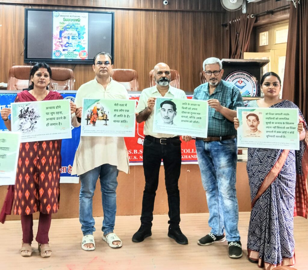 रुद्रपुर। प्रेमचन्द जयंती के अवसर पर सरदार भगत सिंह राजकीय स्नातकोत्तर महाविद्यालय रुद्रपुर में अजीम प्रेमजी फाउंडेशन के सहयोग से एन.एस.एस. और एन.सी.सी. के संयुक्त तत्वाधान एक कार्यक्रम का आयोजन किया गया। इस अवसर पर अजीम प्रेमजी फाउंडेशन की टीम के संजीव, नसीम और सुश्री मनीषा ने एन.सी.सी. के कैडेट्स और एन.एस.एस. के स्वयंसेवियों को पोस्टर प्रदर्शनी, कहानी वाचन और फिल्म शो के माध्यम से प्रेमचन्द के साहित्य और उसमें प्रदर्शित जीवन मूल्यों से परिचित कराया। पोस्टर प्रदर्शनी में प्रेमचन्द के विभिन्न उपन्यासों और कहानियों से लिए गए कथनों और वाक्यांशों को प्रदर्शित किया गया। इन पोस्टरों में प्रदर्शित विचारों के सम्बन्ध में विद्यार्थियों में सोफिया अंजुम, शुवांशु, दिव्यांशु, रेनू, कृतिका, दीपक, प्रशांत कुमार और महाविद्यालय के प्राध्यापक प्रोफेसर हेमलता सैनी, डॉ. अपर्णा सिंह और डॉ. राजेश कुमार सिंह ने भी विचार व्यक्त किए।