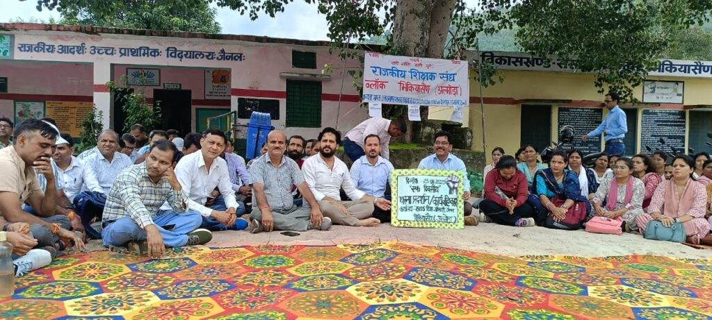 राजकीय शिक्षक संघ ब्लॉक भिकियासैंण के आह्वान पर खण्ड शिक्षा अधिकारी कार्यालय जैनल में एक दिवसीय हुआ धरना प्रदर्शन।