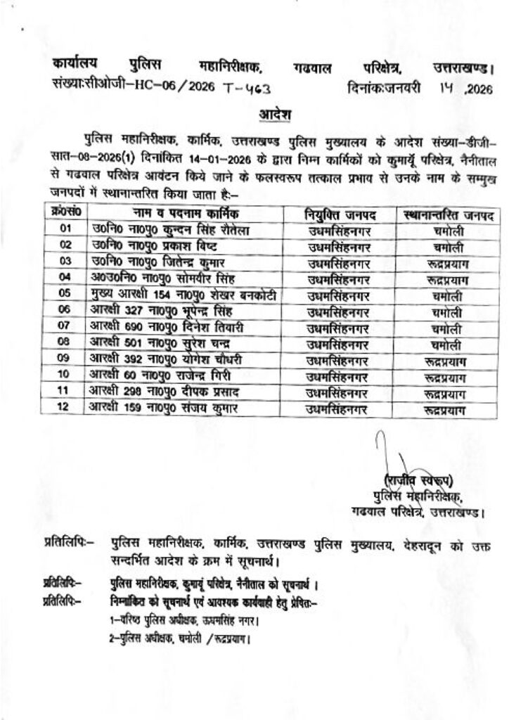 निष्पक्ष एवं पारदर्शी जाँच सुनिश्चित करने के दृष्टिगत प्रकरण से संबंधित निलंबित 03 उपनिरीक्षक, 01 अपर उपनिरीक्षक, 01 मुख्य आरक्षी एवं 07 आरक्षी, कुल 12 पुलिस कर्मियों को तत्काल प्रभाव से गढ़वाल रेंज के जनपद चमोली एवं रुद्रप्रयाग स्थानांतरित कर दिया गया है।