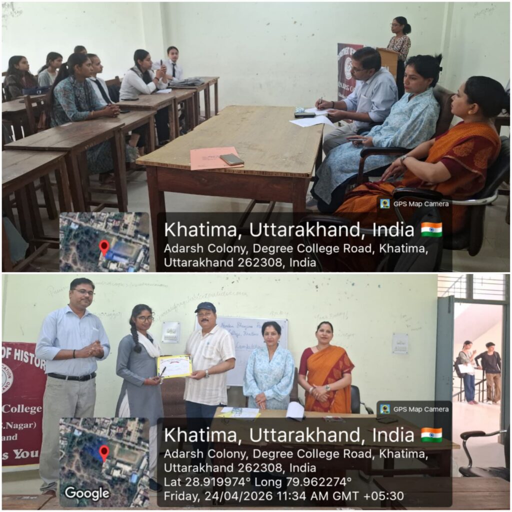 खटीमा (उधम सिंह नगर)। हेमवती नंदन बहुगुणा पीजी कॉलेज खटीमा में विभागीय परिषद कार्यक्रमों के अंतर्गत इतिहास विभाग द्वारा भाषण प्रतियोगिता का आयोजन किया गया। कार्यक्रम का आयोजन विभागाध्यक्ष डॉ. प्रवीण पांडे एवं प्रोफेसर डॉ. नीलम द्वारा किया गया।