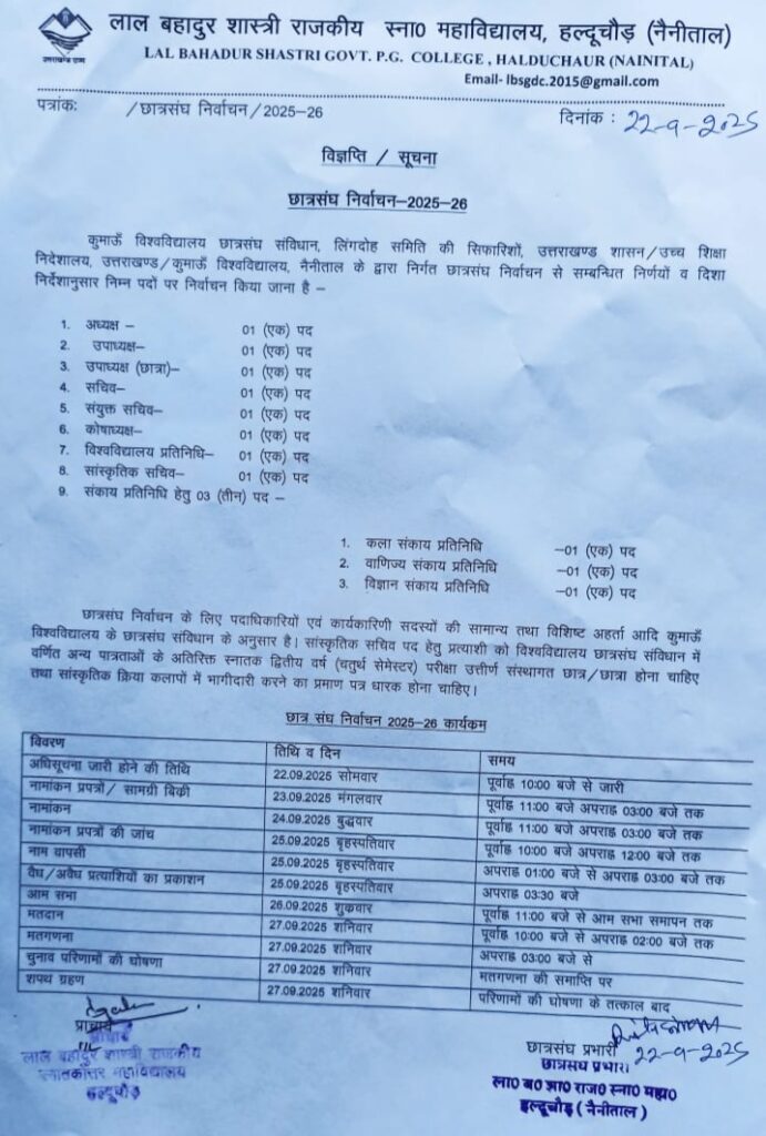 हल्दूचौड़ (नैनीताल)। लाल बहादुर शास्त्री राजकीय स्नातकोत्तर महाविद्यालय, हल्दूचौड़ में कुमाऊं विश्वविद्यालय, नैनीताल की छात्र संघ निर्वाचन 2025-26 की अधिसूचना आज प्रातः 10:00 बजे प्रभारी प्राचार्य प्रो. डॉ. जयचन्द्र कुमार गौतम और चुनाव प्रभारी प्रो. डॉ. अनीता सिंह द्वारा जारी की गई।