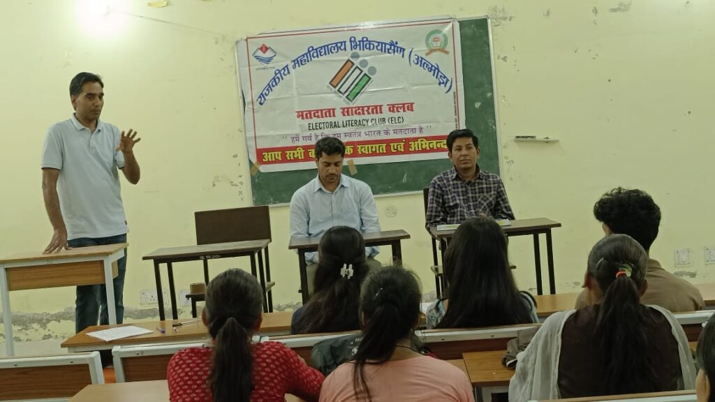 भिकियासैंण। डॉ. प्रताप बिष्ट राजकीय महाविघालय भिकियासैंण में भारत निर्वाचन आयोग के स्वीप कार्यक्रम के अन्तर्गत मतदाता साक्षरता क्लब (ईएलसी) का गठन किया गया। कार्यक्रम का आयोजन महाविद्यालय प्राचार्य प्रो. शर्मिला सक्सेना की अध्यक्षता में हुआ। कार्यक्रम का संचालन स्वीप प्रभारी दिनेश कुमार ने किया। प्राचार्य ने छात्र-छात्राओं को लोकतंत्र की मजबूती के लिए मतदान के महत्व को समझाया। ईएलसी हेतु छात्र प्रतिनिधि सुमित बिष्ट एवं छात्रा प्रतिनिधि अदिति शर्मा एवं सदस्यों को नियुक्त किया गया। कार्यक्रम में महाविद्यालय के प्राध्यापक एवं कर्मचारी उपस्थित रहे।