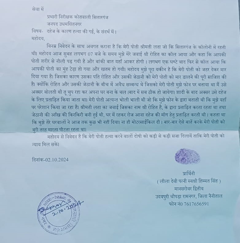 वहीं विवाहिता की संदिग्ध परिस्थितियों में हुई मौत के मामले में सितारगंज पुलिस ने दहेज हत्या का मुकदमा दर्ज किया है। मृतका की नानी ने पुलिस को तहरीर सौंपी है। लीला देवी पत्नी हिम्मत सिंह निवासी मानसरोवर द्वितीय उदयपुरी चोपड़ा रामनगर जिला नैनीताल ने पुलिस को दी तहरीर में कहा है, कि उसकी पोती 22 वर्षीय लता भंडारी का विवाह ढाई वर्ष पूर्व हाथीखाना मोहल्ला सितारगंज निवासी रोहित के साथ हुआ था। लता देवी ने आरोप लगाया कि उसका पति रोहित दहेज के लिए लगातार उत्पीड़न करता था। एक अक्टूबर को लता के मौत की जानकारी मिली। पोस्टमार्टम के बाद अंतिम संस्कार होने के बाद बुधवार को लीला देवी ने लता के पति रोहित पर अपनी भाभी के साथ मिलकर जहर देकर हत्या करने का आरोप लगाया है। पुलिस ने तहरीर के आधार पर बीएनएस की धारा के तहत दहेज हत्या का मुकदमा दर्ज किया है। कोतवाली प्रभारी भूपेंद्र सिंह बृजवाल ने बताया कि पुलिस मामले की जांच कर रही है।