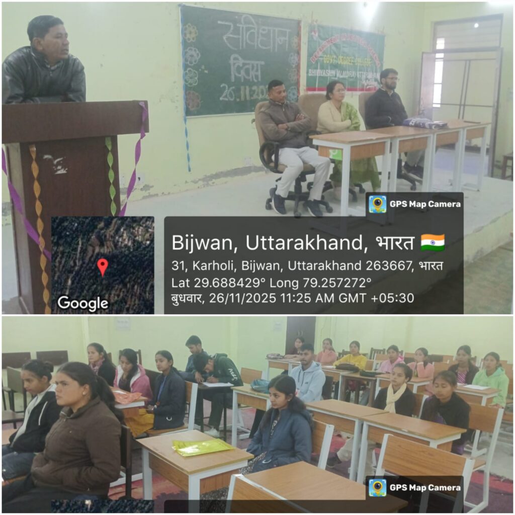 संविधान दिवस कार्यक्रम के तहत कार्यक्रम प्रभारी डॉ. दिनेश कुमार, डॉ. सुभाष आर्य और शेर सिंह ने संविधान के मूल्यों, सिद्धांतों और इसके महत्व को विस्तार से समझाया। छात्राओं खुशी रावत, शालिनी जोशी एवं तनु अधिकारी ने भी अपने संबोधनों में संविधान द्वारा प्रदत्त मौलिक अधिकारों के महत्व और उनके संरक्षण पर जोर दिया।