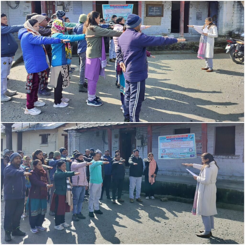 अल्मोड़ा। राष्ट्रीय मतदाता दिवस के उपलक्ष्य में जनपद अल्मोड़ा में जिला कार्यालय सहित समस्त शासकीय कार्यालयों में मतदाता जागरुकता कार्यक्रम आयोजित किए गए। इस अवसर पर अधिकारियों एवं कर्मचारियों द्वारा लोकतांत्रिक मूल्यों की रक्षा, निष्पक्ष एवं निर्भीक होकर मतदान करने तथा अन्य नागरिकों को भी मतदान के प्रति जागरुक करने की शपथ ली गई।